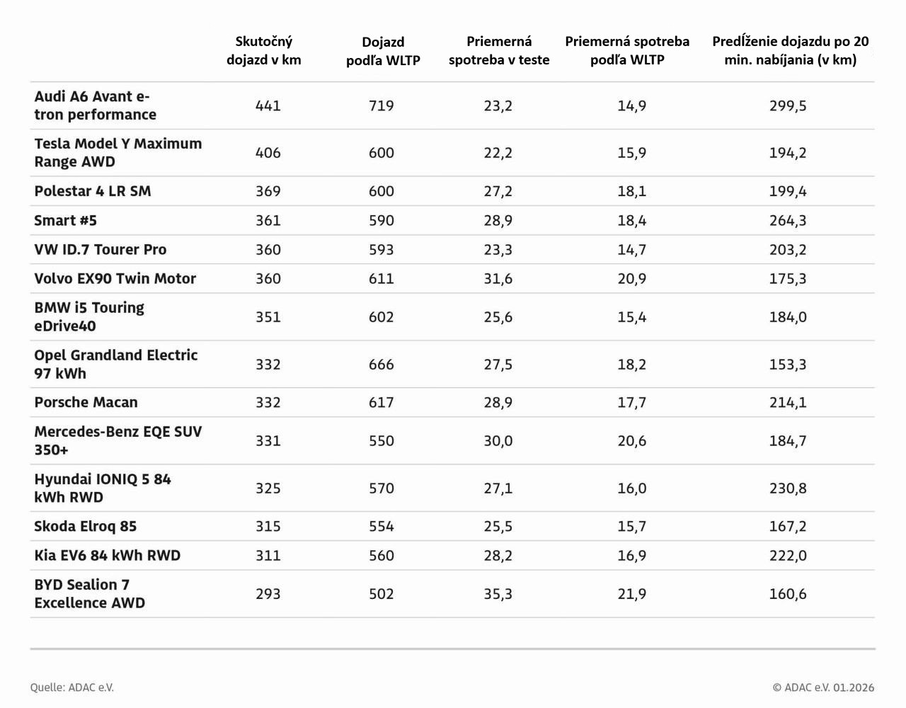 Čo ADAC ďalej taktne zamlčal, je priemerná rýchlosť. Porovnanie našich vlastných skúseností s dosiahnutou priemernou spotrebou v tomto teste mám naznačuje, že metodika merania zďaleka nevyužívala maximálny výkon skúšaných áut. Chceme tým povedať, že elektromobily s veľkou pravdepodobosťou nevyužívali svoju maximálku na úsekoch A9 s neobmedzenou rýchlosťou, ale držali sa skôr odporúčaného tempa. Inak by boli čísla prevádzkovej efektivity výrazne horšie.