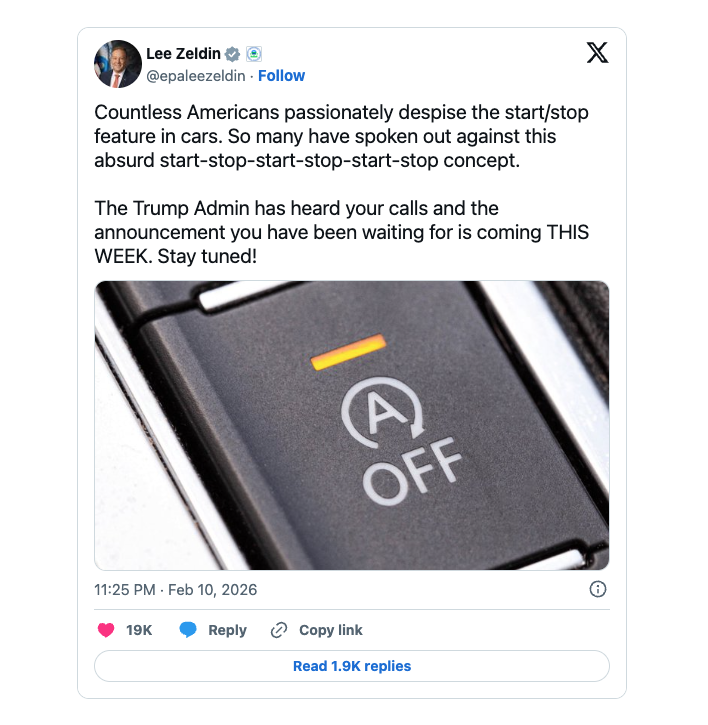 Šéf americkej Agentúry pre ochranu životného prostredia (EPA) Lee Zeldin označil stop-štart za „absurdný“ systém, ktorý Američania „vášnivo nenávidia“. V príspevku na sociálnej sieti sľúbil, že EPA odpovie na sťažnosti nespočetného množstva vodičov, ktorým prekáža vypínanie motora pri každom zastavení. Tvrdí, že administratíva vypočula volanie ľudí, ktorým prekáža „start‑stop‑start‑stop koncept“ pri každej križovatke, a že oznámenie, na ktoré čakajú, prichádza.