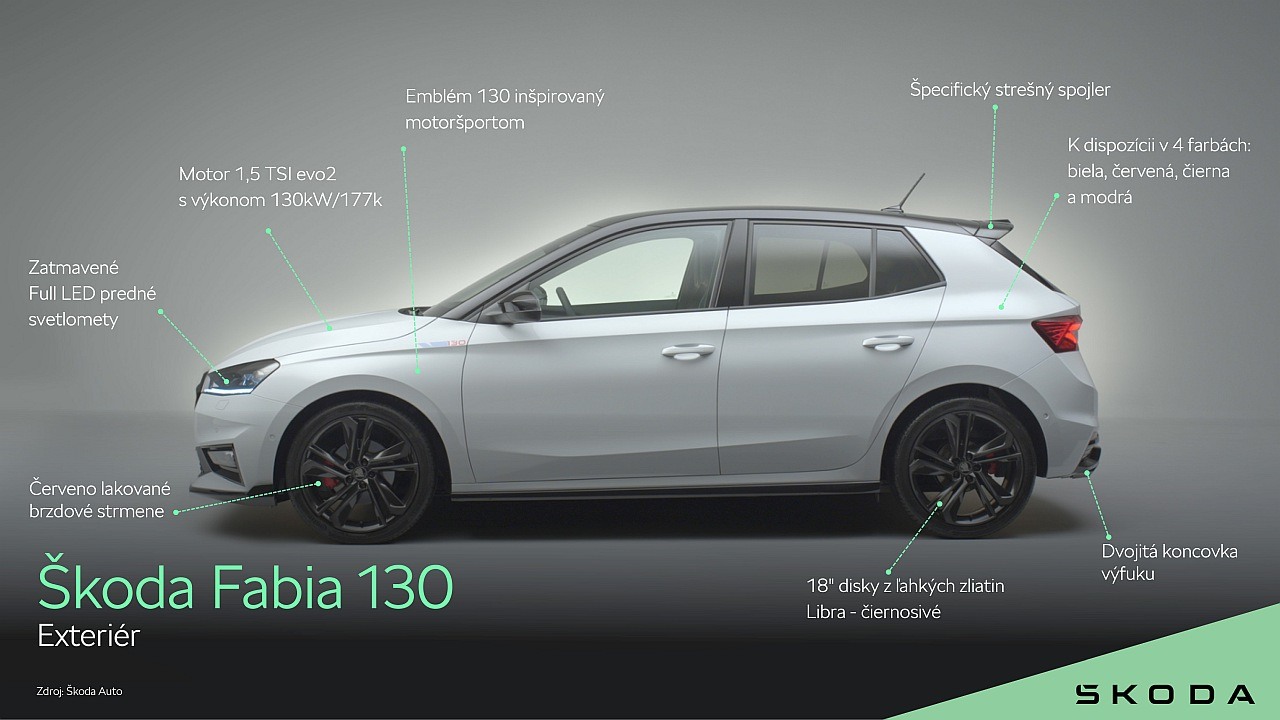 Fabia 130 vychádza z výbavy Monte Carlo, k dispozícii bude v bielej, červenej, modrej a čiernej farbe s kontrastnou čiernou strechou a stĺpikmi. Len pre doplnenie, základný model s 1.5 TSI a 7-stupňovým DSG začína na 19 380 eur za Selection alebo 21 980 eur za Monte Carlo.