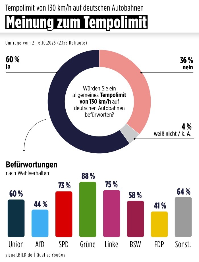 Prieskum sa robil začiatkom októbra 2025 a celkovo opýtaných bolo 2355 ľudí starších ako 18 rokov, kde iba 36% bolo proti. Pomer Nemcov, ktorí sú za obmedzenie maximálnej rýchlosti, sa v posledných rokoch zväčšuje. Napríklad podľa štatistík z júla 2024 sa k obmedzeniu vyjadrilo kladne 57% dotázaných. Podobné čísla zaznamenal aj ADAC v januári 2025, kde 55% jeho členov podporilo zavedenie obmedzenia rýchlosti.