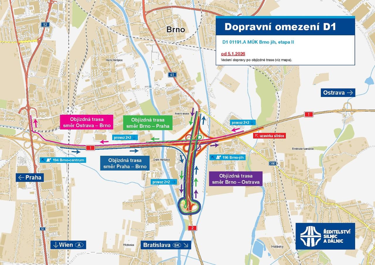Vodiči jazdiaci z Ostravy do Brna nebudú môcť križovatku Brno-juh využiť vôbec, budú musieť zísť o zjazd skôr, alebo o zjazd neskôr. No a posledná zmena je pre vodičov z Brna na smer Ostrava. Nevyužijú doterajšie spojenie na D1, ale opäť pôjdu rovno smer Bratislava, otočia sa pri ASP a následne z D2 odbočia doprava na D1 smer Ostrava. A aj keď niektoré vetvy už nefungovali ani pred 5. januárom, toto je taká pripomienka pre tých, ktorí plánujú jazdu cez Brno a budú sa čudovať, prečo sú kolóny ešte väčšie, obzvlásť v inkriminovaných časoch doobednej a poobednej špičky.