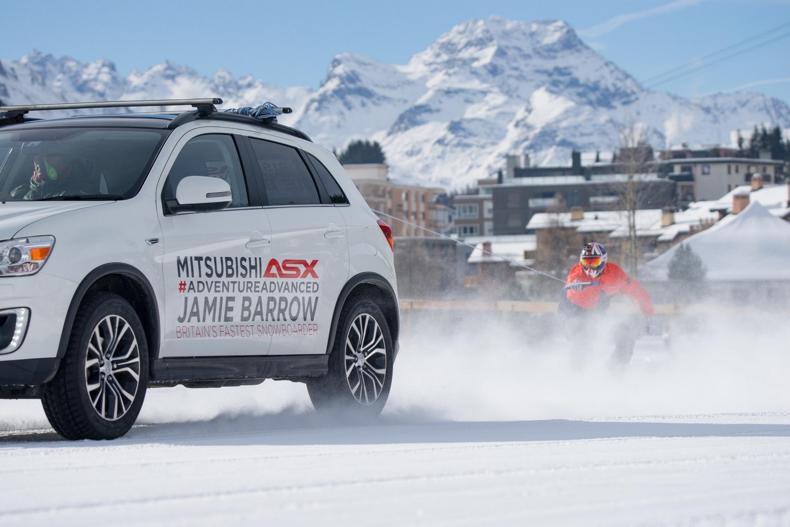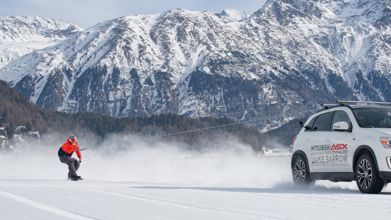 Najrýchlejší snowboardista z Anglicka už v minulosti stanovil rekord zjazdom zo svahu rýchlosťou viac než 150 km/h. Tentoraz sa vybral na zamrznuté jazero St. Moritz vo Švajčiarsku, aby stanovil ďalší rekord. Oproti predchádzajúcej disciplíne sa jazdilo na rovnej ploche, no najväčšou zmenou bolo, že snowboardistu ťahalo auto. Na túto úlohu sa podujalo Mitsubishi, konkrétne typ ASX s 2.2 litrovým DI-D motorom a pohonom všetkých štyroch kolies. Auto vybavené systémom aktívnej stabilizácie a trakcie (MASTC) mala optimalizovať trakciu. Paradoxne, jedna z mála vecí, na ktoré sa Jamie Barrow sťažoval, bola nedostatočná trakcia auta, ktorá mu na krátkom úseku zabezpečila rýchlosť „len“ 100 km/h. Nemôžeme to Mitsubishi vyčítať, keďže ASX jazdilo na ľade pokrytom mäkkým snehom, čo bola v tomto prípade asi najhoršia možná kombinácia.