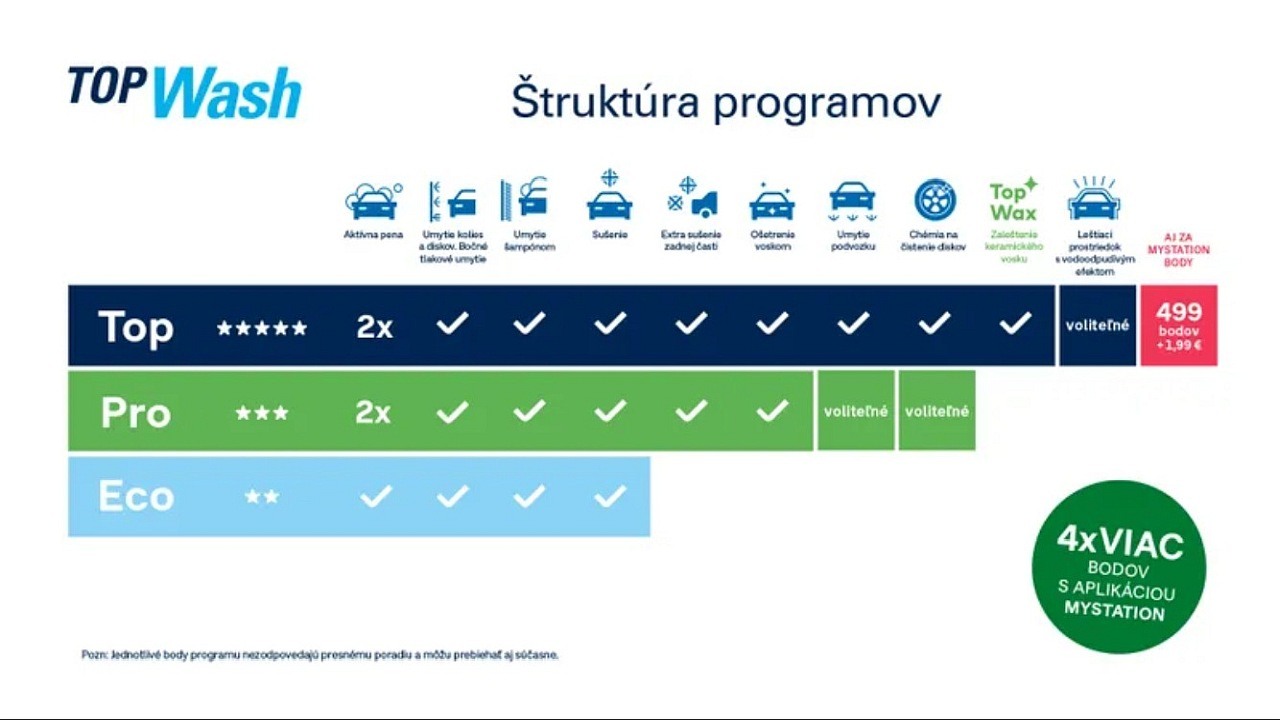 OMV TopWash poskytuje možnosť umytia vozidla prostredníctvom rôznych umývacích systémov. Či už sa rozhodnete pre automatické autoumyvárky alebo samoobslužné umytie, obe tieto možnosti zabezpečia efektívne a dôkladné čistenie vášho auta podľa toho čo práve v tom momente potrebujete. Jednotná programová štruktúra, najmodernejšie vybavenie, neustála kontrola a optimalizácia postupov zaručujú vysokú kvalitu umytia.