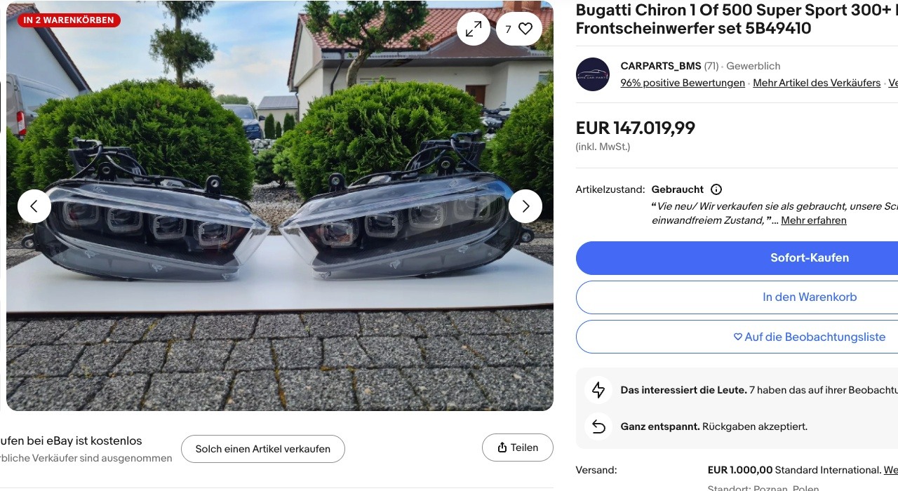 Napríklad na aukčnom portáli ebay je ponuka originálnych predných LED svetlometov pre Bugatti Chiron, a ich cena vás doslova zavalí – 147 000 eur za jeden pár! Pričom predajca sa nachádza v Poľsku a je schopný ich zaslať do celej Európy za dodatočný poplatok 1000 eur. Táto suma by vám pokojne umožnila kúpu celkom nového Porsche 911 Carrera.