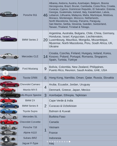 Podľa dát od analytickej spoločnosti JATO Dynamics, ktoré publikoval Felipe Munoz, je jasným víťazom roku 2024 opäť Porsche 911. Tento model sa stal najpredávanejším športovým autom v mnohých krajinách sveta – dokonca aj v Andorre, kde bol celkovo najpredávanejším novým autom roka. Ako to vyzerá v ďalších krajinách? Pozrite si obrázok nižšie a zistite, kto vládne športovým autom v rôznych regiónoch sveta.