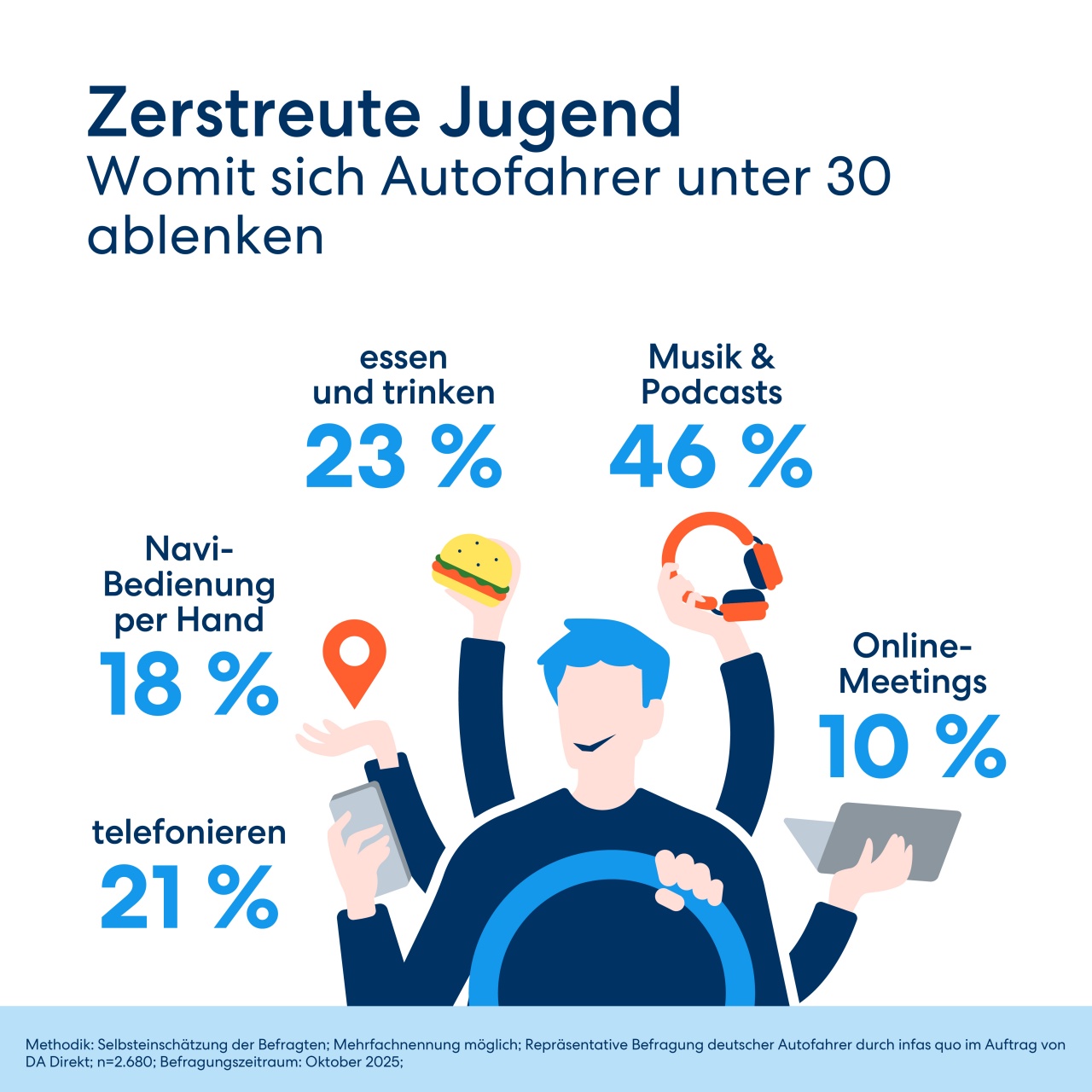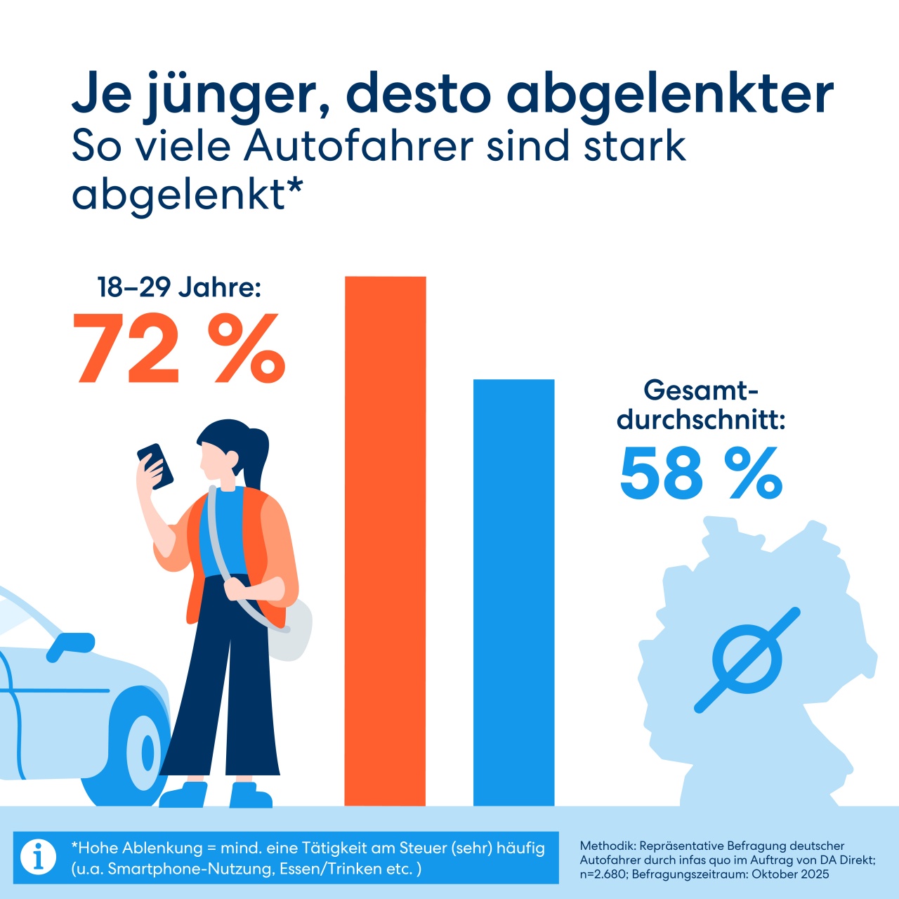 Až 72% vodičov vo veku do 30 rokov je počas jazdy výrazne rozptýlených. Mladí vodiči výrazne častejšie využívajú počas jazdy smartfón - až takmer každý tretí z nich. Namiesto bezpečného ovládania cez handsfree často píšu SMS správy alebo menia nastavenia v iných aplikáciách. Nebezpečné je aj zapojenie sa do pracovných konferenčných hovorov cez aplikácie ako Teams či Zoom, ktoré má síce možnosť vypnutia obrazu, ale aj tak výrazne odťahujú pozornosť od jazdy.