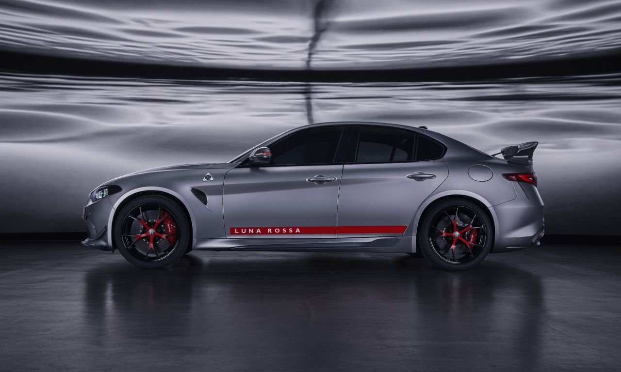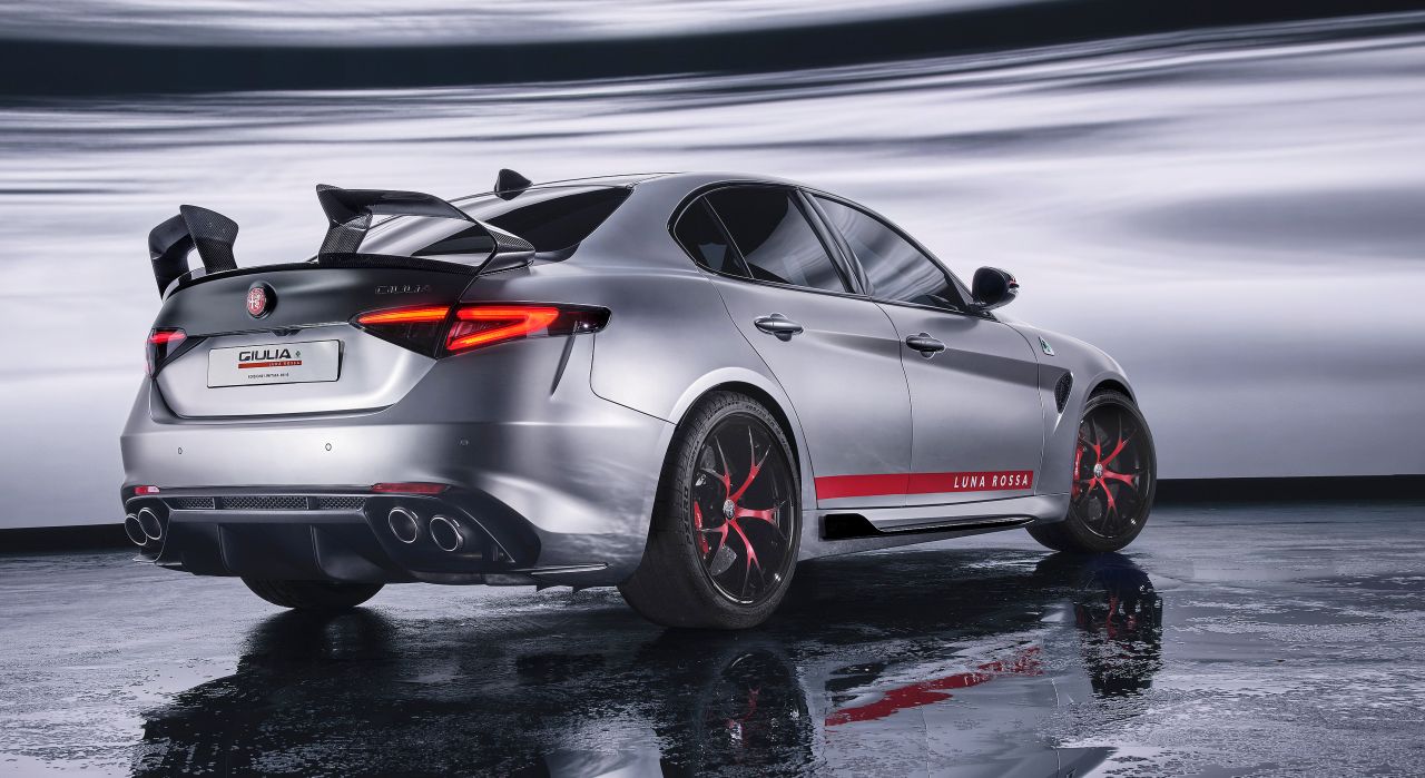 Automobilka hovorí, že táto zostava generuje päťnásobný prítlak v porovnaní so sériovým variantom, takže pri rýchlosti 300 km/h Giuliu tlačí k asfaltu 140 kg. Aby Alfa vyzdvihla výnimočnosť tohto stroja, dizajnéri použili dvojfarebné lakovanie kombinujúce sivú s čiernou a za zmienku stoja tiež prvýkrát použité červené logá.