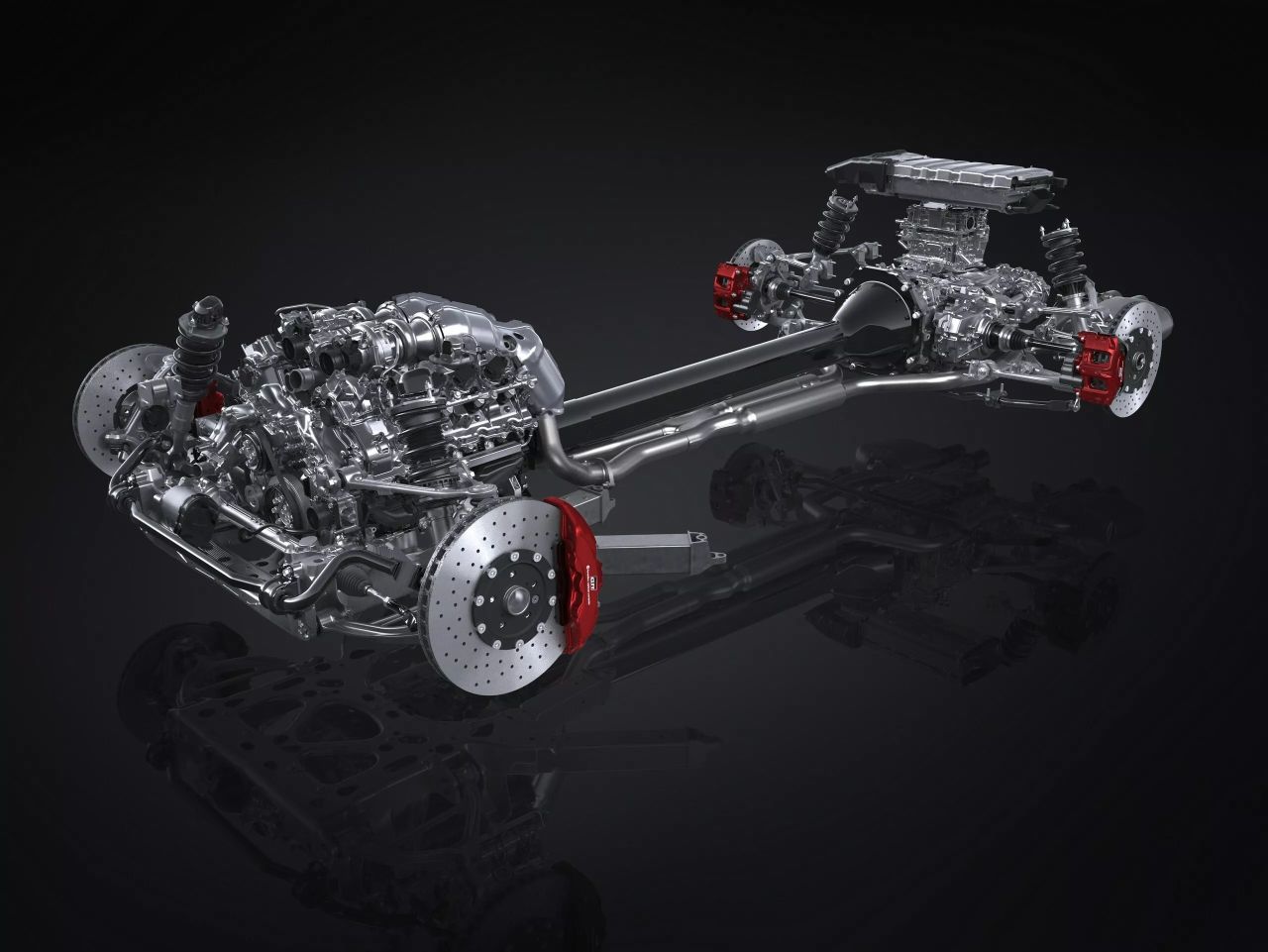Japonská odpoveď na kupé AMG GT využíva podobne ako Mercedes dvakrát preplňovaný vidlicový osemvalec, dokonca so zhodným objemom 4,0 litra a mazaním so suchou vaňou. Podľa predbežných informácií máme pred sebou elektrifikovanú V8, ktorá prostredníctvom karbónového kardanu, automatu a samosvorného diferenciálu posiela na zadnú nápravu 650 koní. Osemstupňová prevodovka (systému transaxle s mokrou spojkou namiesto hydrodynamického meniča) násobí maximálny krútiaci moment 850 newtonmetrov.