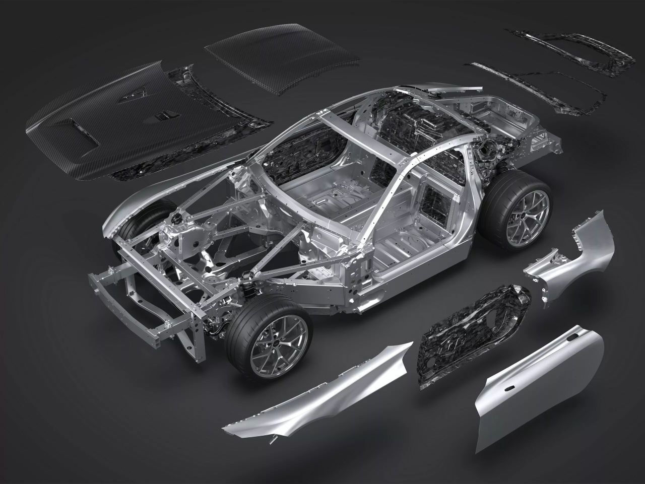 GR GT dostalo celohliníkový rám karosérie a vonkajšie panely vyrobené z plastu vystuženého uhlíkovými vláknami. Presné parametre zatiaľ nečakajte, ale... Podľa Toyoty bude auto vážiť 1750 kg „alebo ešte o niečo menej“, počítajte s rozložením hmotnosti 45:55.