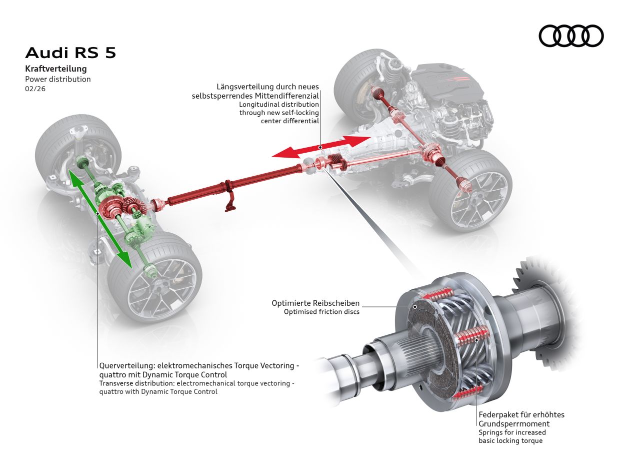 Prevodovka posiela výkon oboch jednotiek na všetky štyri kolesá, pričom Quattro je v tomto prípade doplnené o medzinápravový samosvorný diferenciál novej generácie s permanentným predpätím, takže vždy je aspoň čiastočne uzamknutý. Silu rozdeľuje v pomere od 70:30 do 15:85, to ale nie je všetko.