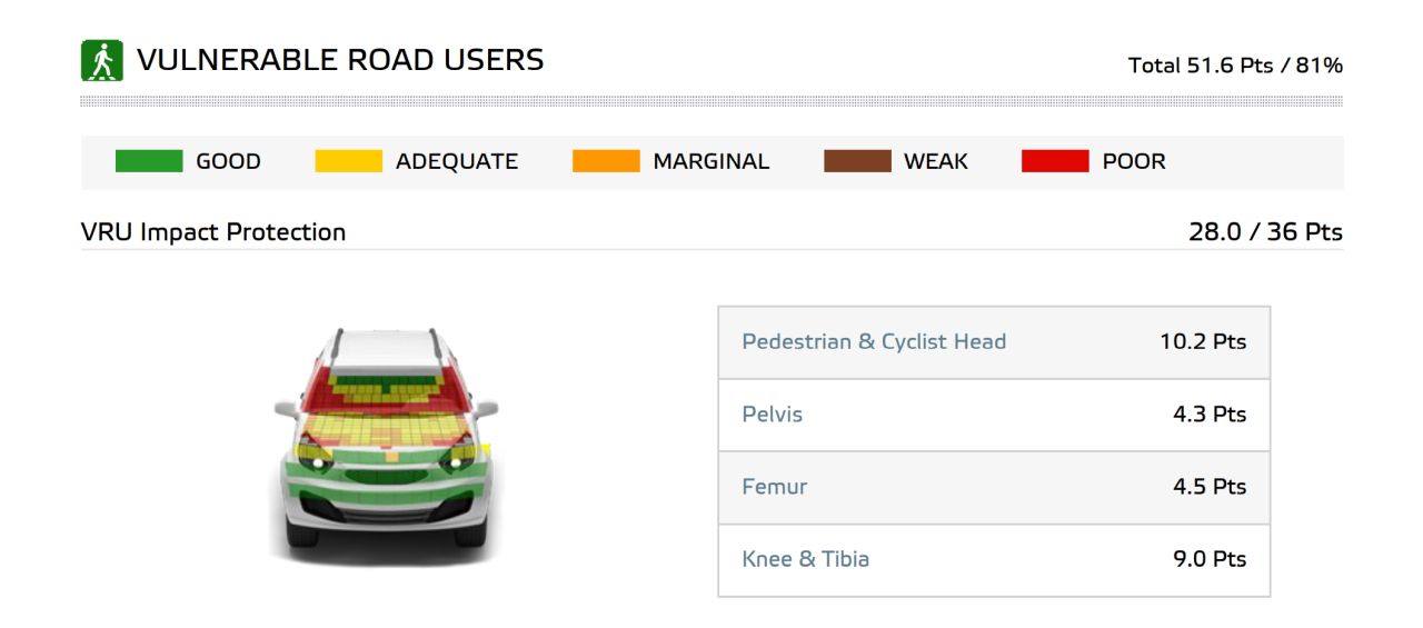 Predné partie sú dokonca dosť poddajné na to, aby si vyslúžili zelenú, s prednou hranou kapoty to však bude o niečo horšie, čo platí tiež pre stĺpiky a spodnú časť čelného skla. Kde Porsche tiež neuspelo, bola simulovaná situácia, pri ktorej pri zhoršenej viditeľnosti vybehne dieťa spoza zaparkovaných áut. Cayenne zareagovalo a spomalilo, nestihlo ale zastaviť úplne.