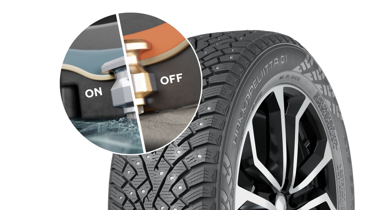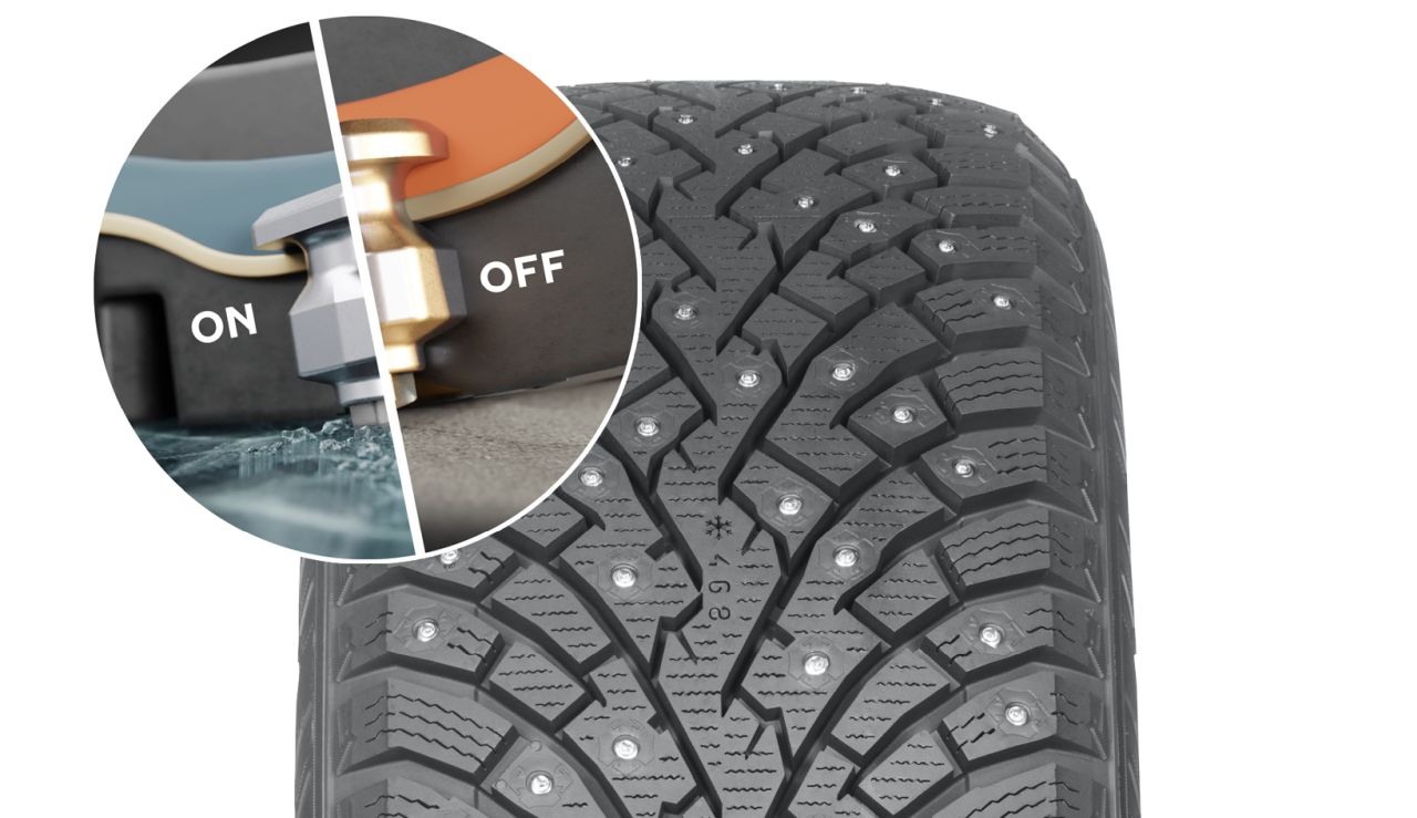 Vďaka konštruktérom sa podarilo vyvinúť adaptívnu základnú vrstvu pneumatiky, ktorá reaguje na zmeny teploty. Ak sú vyššie, je poddajná a hroty sa pri jazde zasunú. Ak začne teplota klesať stuhne, hroty nepustí a tie ostávajú v zábere.