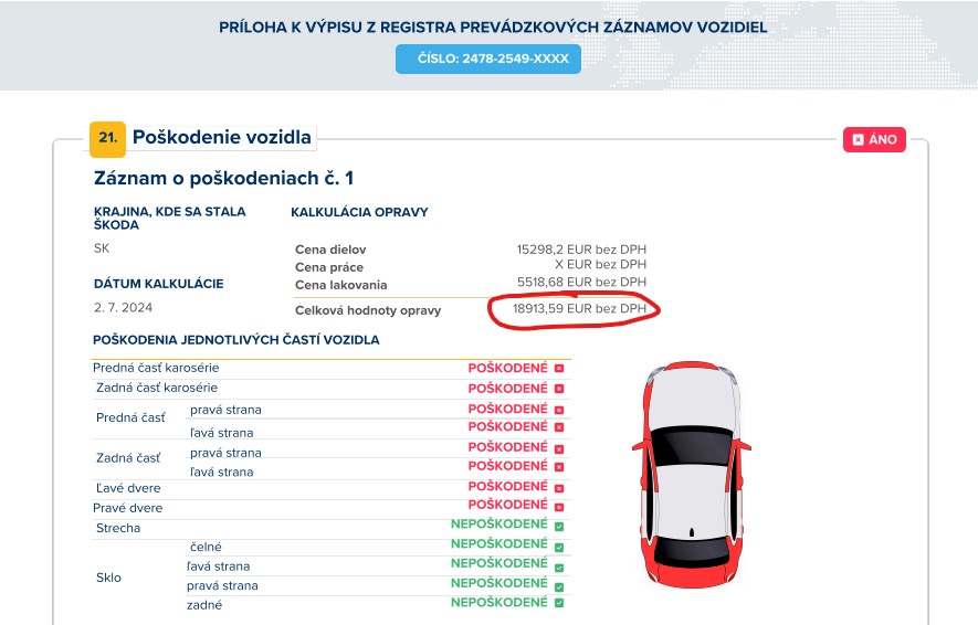 Hovorím si, to je fajn, až kým som sa nepozrel na odhadovanú sumu na opravu. Najprv som nechcel tomu číslu veriť a rátal som počet číslic, či som sa nepomýlil. Auto s rokom výroby 2022 totiž malo v roku 2024 dopravnú nehodu s odhadovanou sumou na opravu v hodnote takmer 19 tisíc eur bez DPH! To je absolútne jasná totálka. Podľa dostupných cenníkov sa hybridný Yaris predával s takouto výbavou v roku 2022 za približne 20 tisíc eur, ale s DPH.