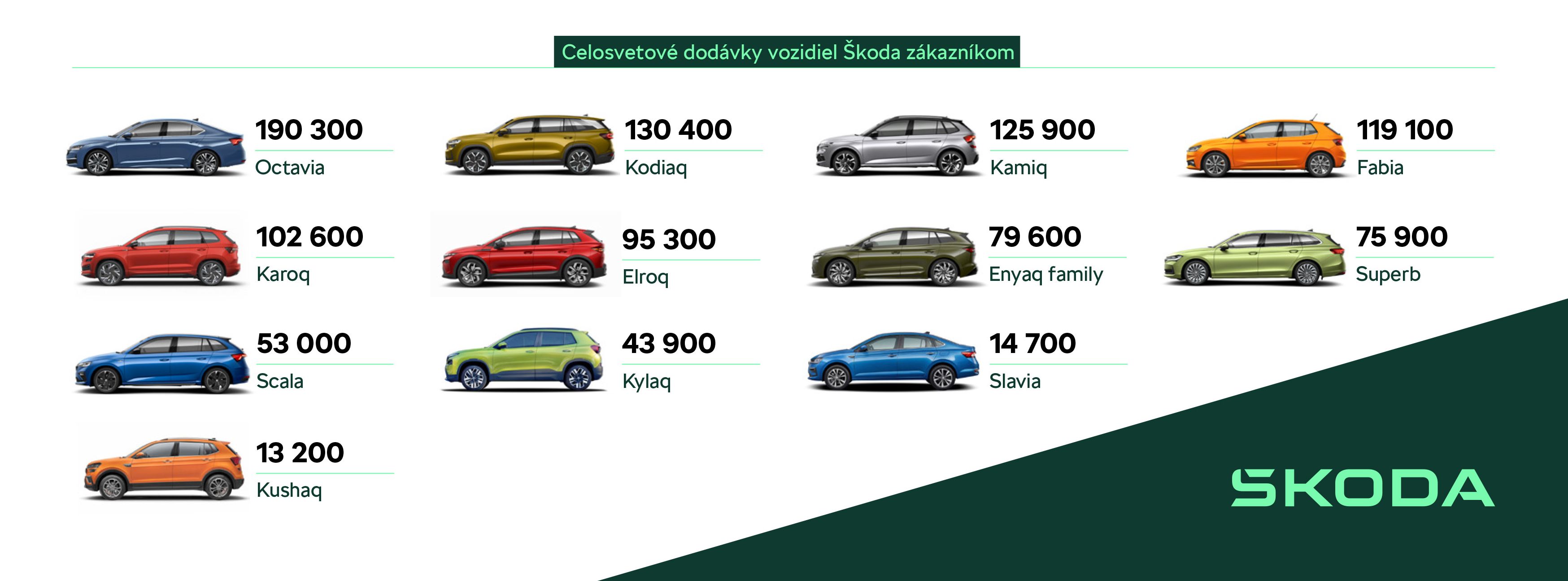 Za uplynulých dvanásť mesiacov sa jej podarilo dodať zákazníkom celkovo 1 043 900 vozidiel, čo predstavuje medziročný nárast o 12,7 percenta! Absolútne najžiadanejším modelom sa stala Octavia (190 300 kusov), zatiaľ čo na druhom mieste trochu prekvapivo skončilo vlajkové SUV, teda Kodiaq – s počtom 130 400 dodávok. Tretím najúspešnejším modelom sa stal Kamiq (125 900) pred Fabiou (119 100 kusov).