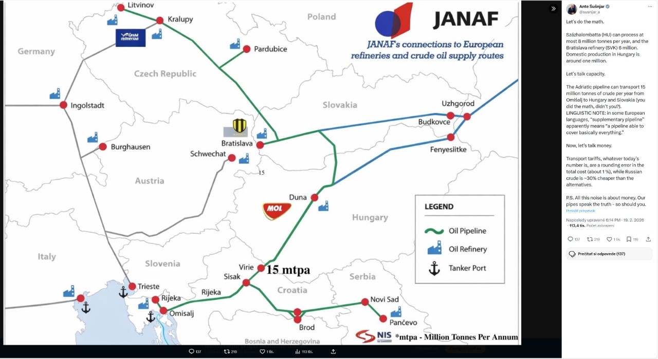 Chorvátsky minister zároveň upozornil na cenový rozmer celej situácie. Prepravné tarify podľa jeho vyjadrenia predstavujú približne jedno percento z celkových nákladov na ropu.