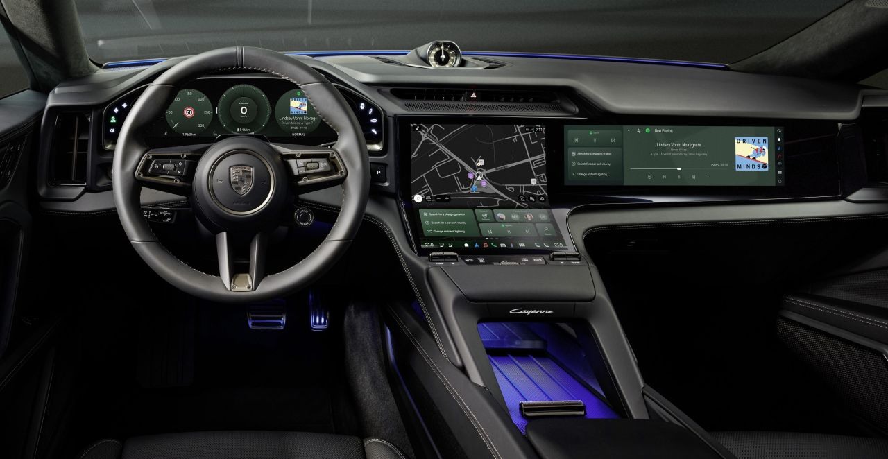 Túto teóriu podporujú aj pred dvomi týždňami zverejnené oficiálne fotografie interiéru nového Cayenne Electric, ktoré ukazujú, že veľké Porsche dostane ako prvé auto zakrivený stredový dotykový displej. A spolu s ďalšou veľkou obrazovkou pred spolujazdcom posunie zobrazovanie údajov pre posádku na doteraz nevidenú úroveň – teda v prípade tejto značky.