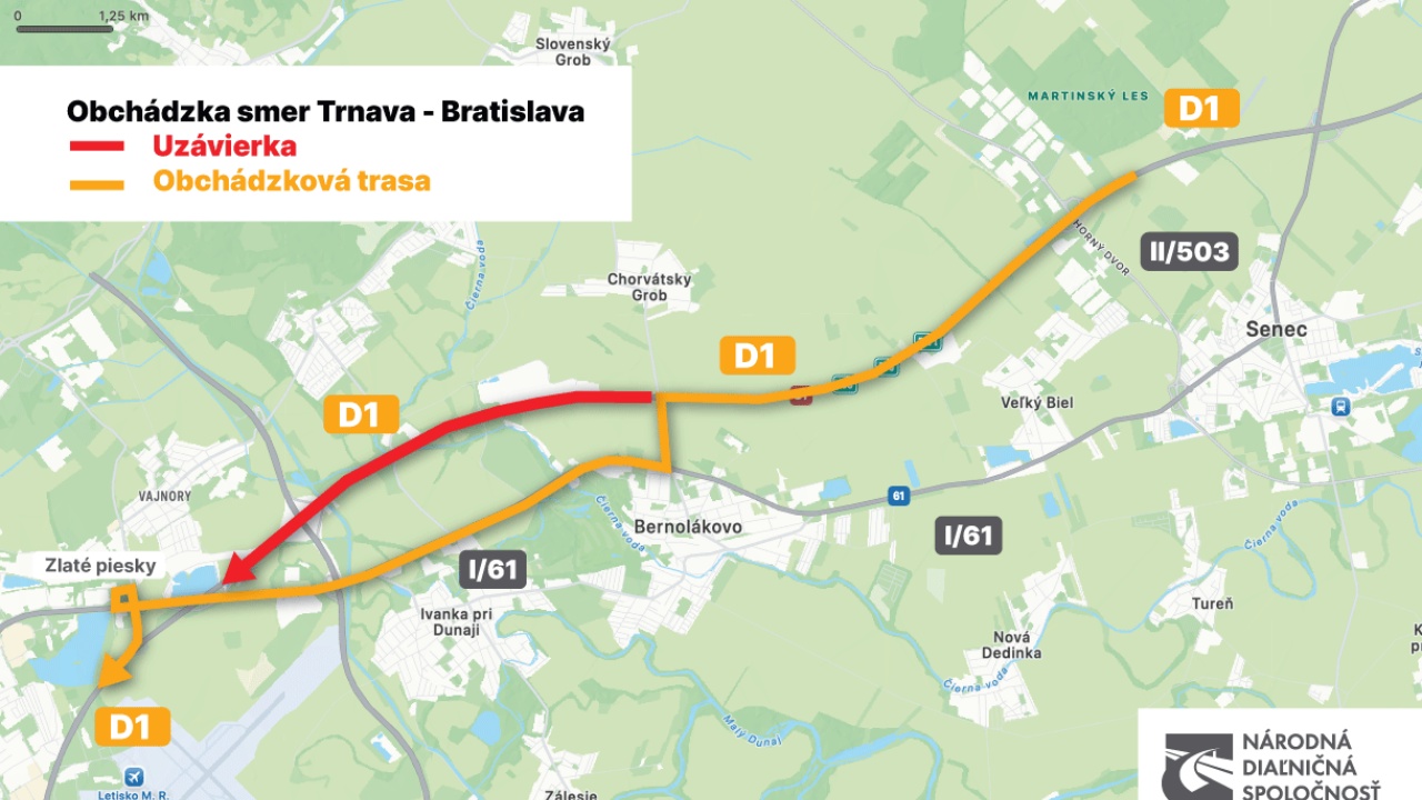 Uzávierka diaľnice D1 v smere do Bratislavy sa začne vo štvrtok 9. apríla o 22:00 a potrvá do nedeľného večera, 12. apríla. Diaľnica bude neprejazdná v úseku od križovatky Bernolákovo – Triblavina až po Bratislavu (Zlaté Piesky). Opačný smer, teda výjazd z Bratislavy, ostáva bez obmedzení.