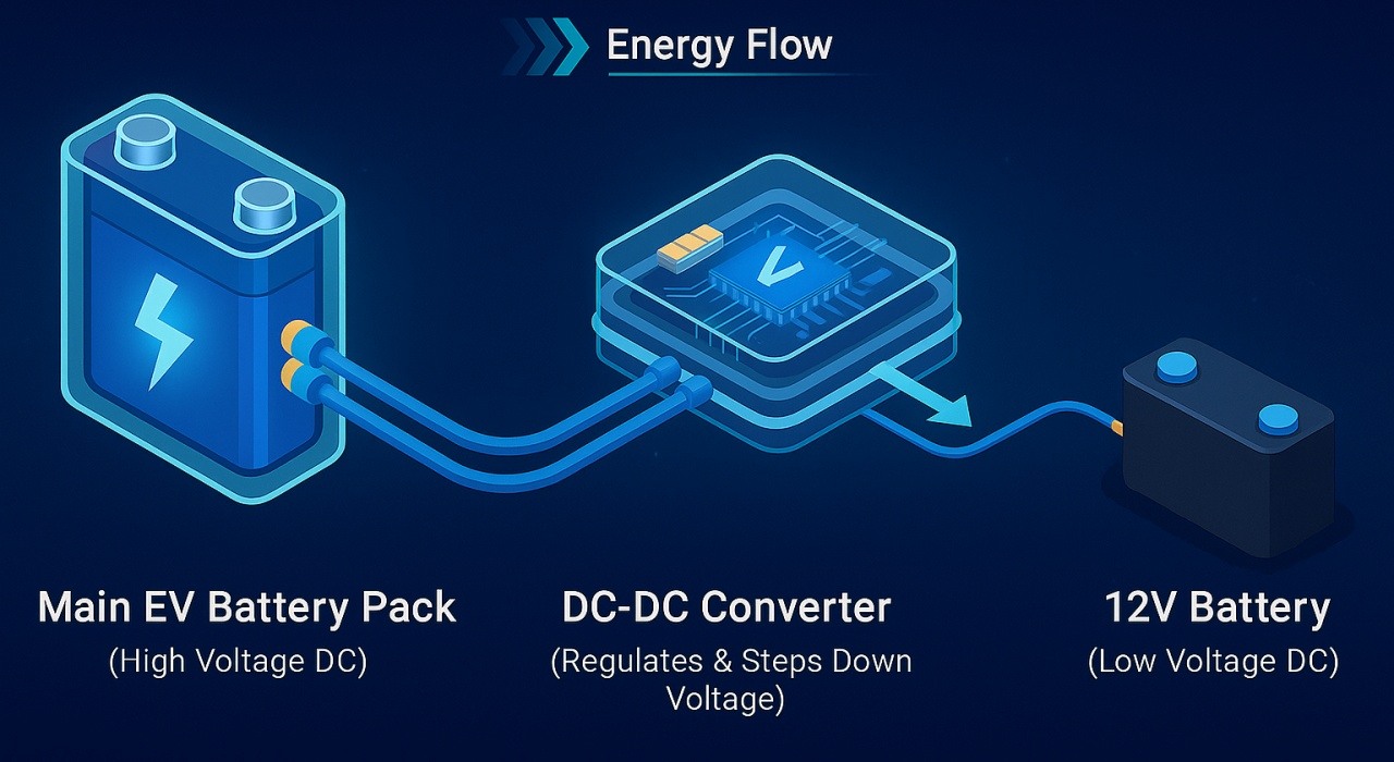 Okrem toho sa cez DC/DC menič energia z hlavnej batérie priebežne premieňa na 12 voltov, čím sa táto pomocná batéria priebežne dobíja. Bez nej by sa vôbec „neprebudil mozog auta” – počítače, riadiace jednotky ani softvér pohonu. Takže rovnako ako v benzínových autách, 12-V batéria pomáha naštartovať elektroniku vozidla predtým, ako sa aktivuje vysokonapäťový systém.