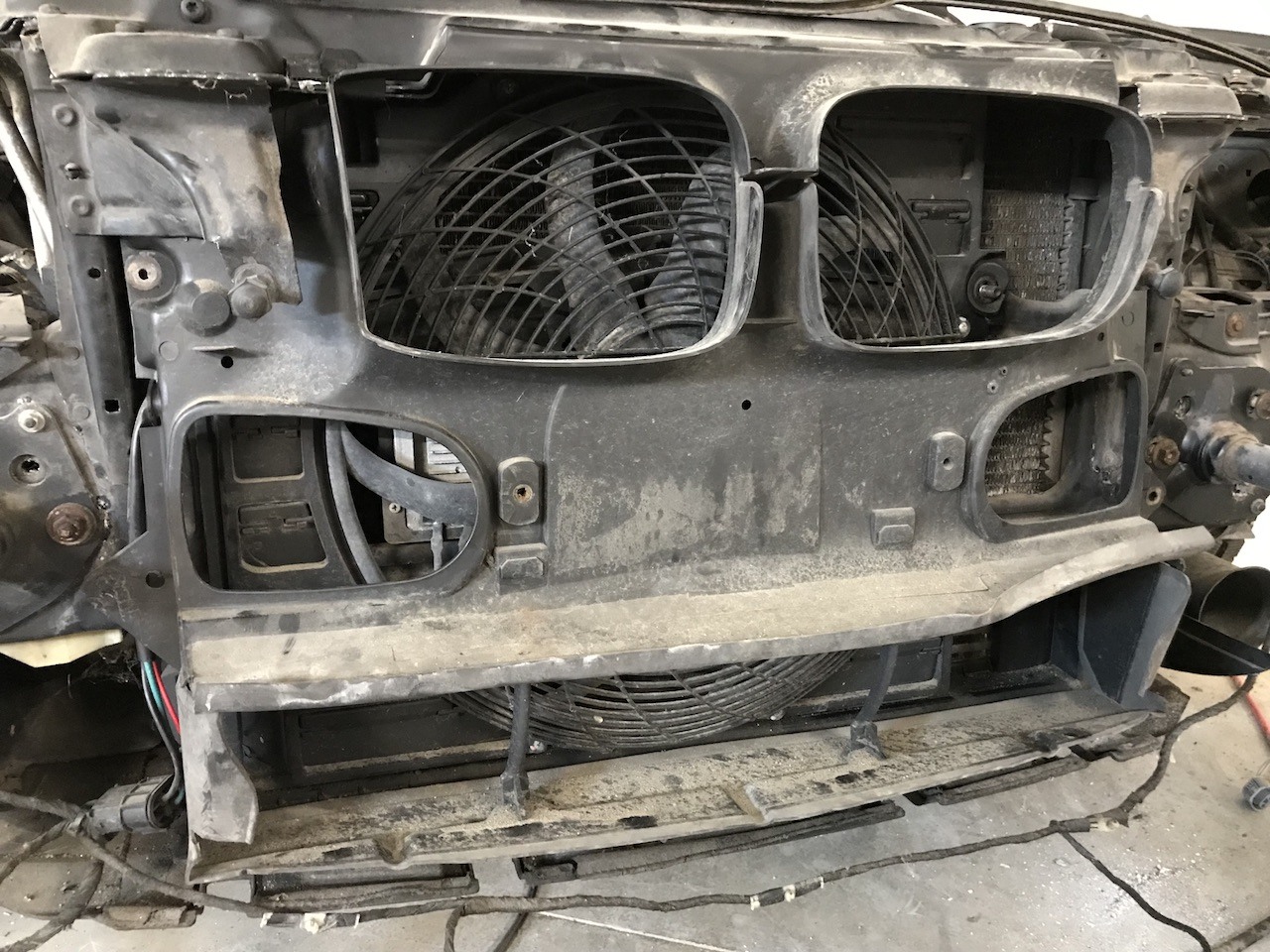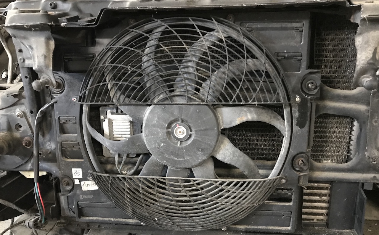 Nový intercooler som porovnal so starým. A prekvapili ma zálisy hliníkovej časti, ktorých bolo viac a kratších, miesto menej a dlhších, ako na starom originále. Starý chladič bol už od oleja a úplne tesný nebol ani pred nehodou. Kryt okolo vrtule klimatizácie som opäť vyriešil len výmenou samotného krytu, ktorý som našiel medzi množstvom vecí, ktoré mám pre istotu odložené v garáži. Musel som teda vrtuľu s motorom oddeliť od starého a nainštalovať do nového krytu.