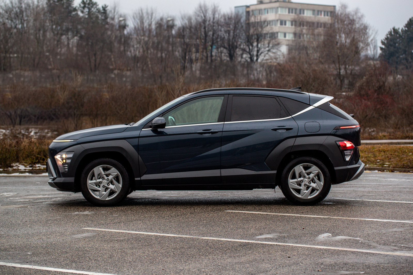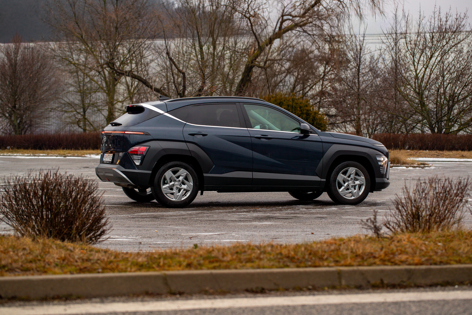 Z profilu pôsobí Kona robustnejšie než naznačujú tabuľkové čísla – výrazné plastové lemy blatníkov, ostré zlomy pozdĺž bokov a mierne sklonený zadný stĺpik jej dávajú športovejší postoj. Zadná časť nadväzuje na predné partie pásom LED a úzkymi svetlami v rohoch nárazníka, takže aj zozadu pôsobí moderne a opticky širšie.