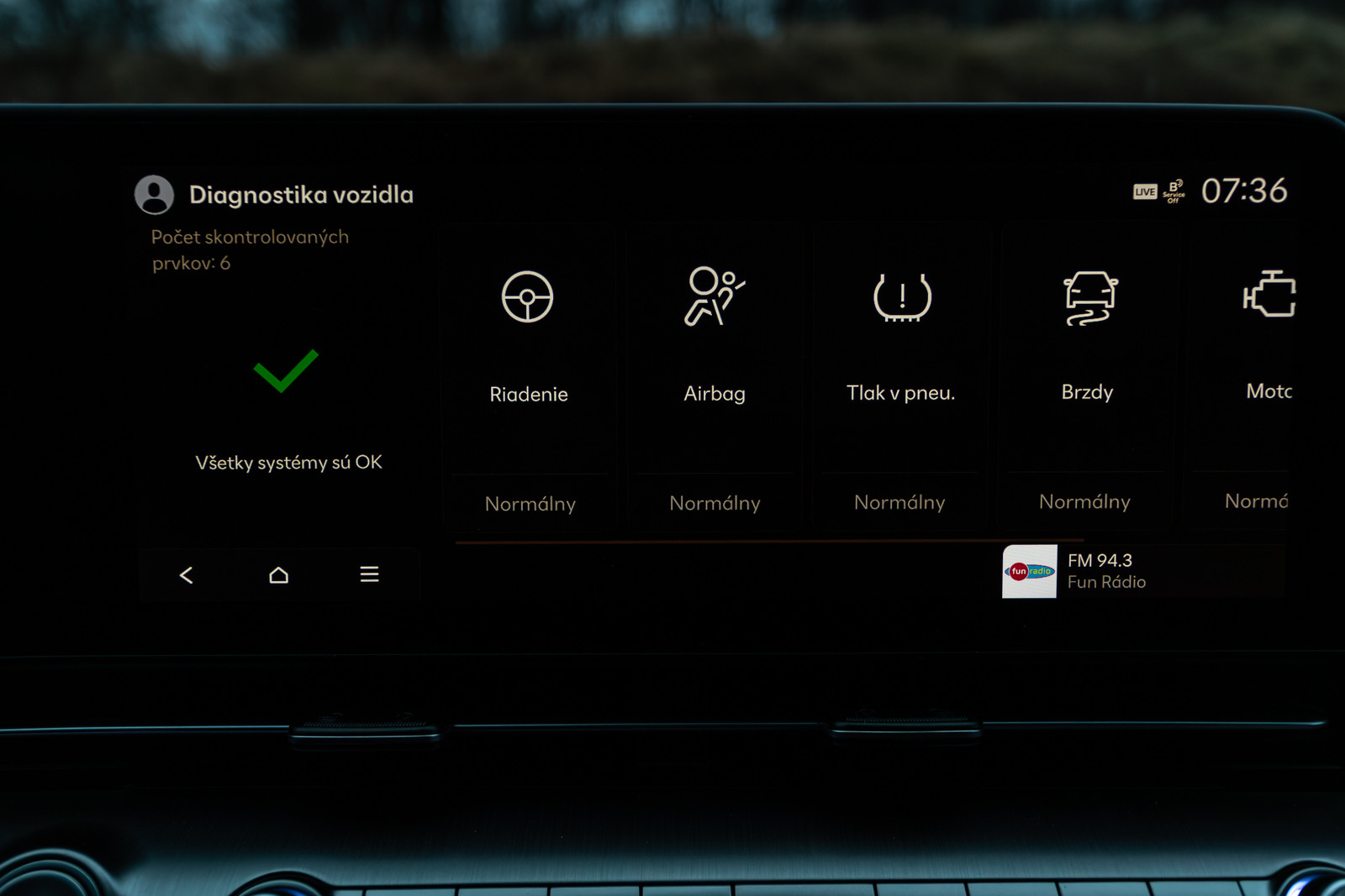 K dispozícii je aj jednoduchá diagnostika vozidla, ktorú si môžete zobraziť v infotainmente. Ide o akúsi rýchlu kontrolu, či je všetko v poriadku – od tlaku v pneumatikách, cez stav motora, bŕzd a ďalších prvkov. Je to presne ten typ funkcie, ktorú nepoužívate každý deň, ale v správnej chvíli vie príjemne upokojiť, že auto je „fit“.